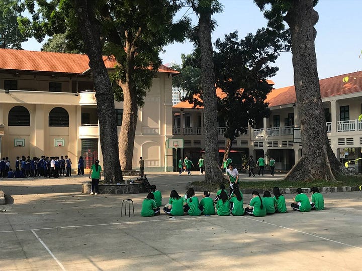 The schools I teach at are located throughout Saigon. Modern schools usually look somewhat like a prison: a large square or a U-shaped building with classrooms along the perimeter, open hallways, and a big space in the middle which, depending on the needs, may serve as a gym, a canteen, or a place for different events.